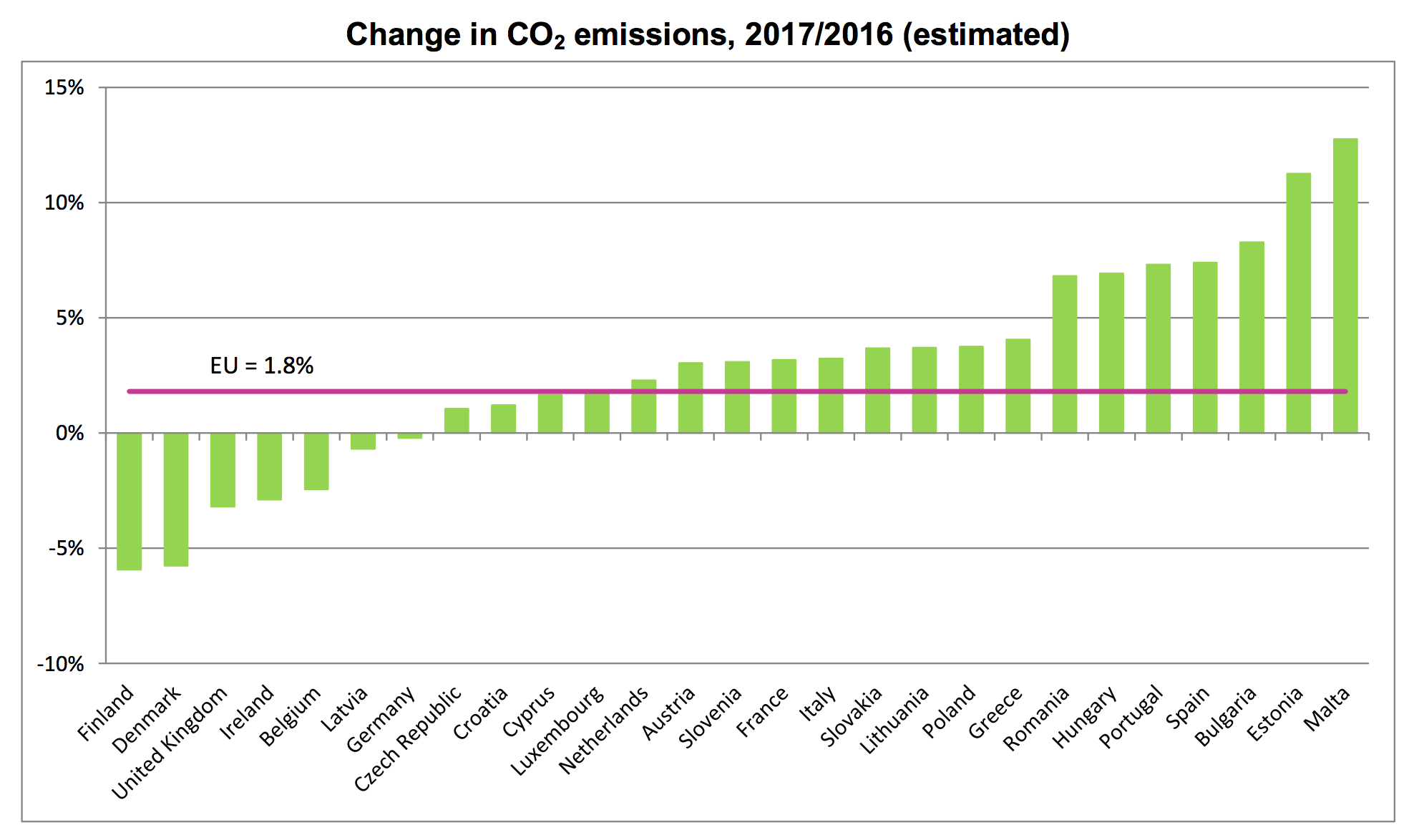 “According to Eurostat estimates, CO2 emissions rose in 2017 in a majority of EU Member States, with the highest increase being recorded in Malta (+12.8%), followed by Estonia (+11.3%), Bulgaria (+8.3%), Spain (+7.4%), and Portugal (+7.3%).