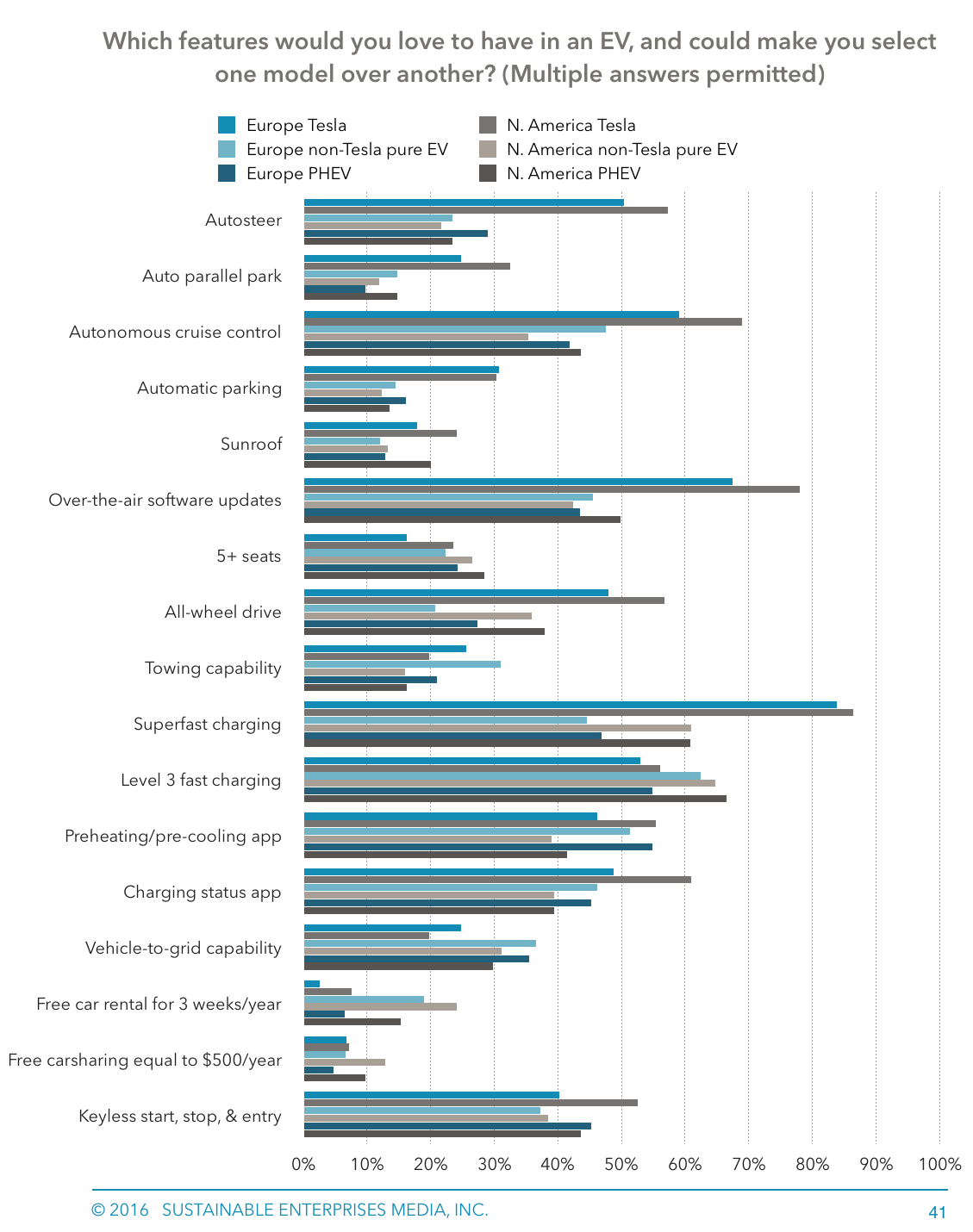 Back to super-fast charging (which, to reiterate, only Teslas currently offer), it is interesting that North American drivers (especially plug-in hybrid drivers and non-Tesla non-EV drivers) desire this much more than their European counterparts.