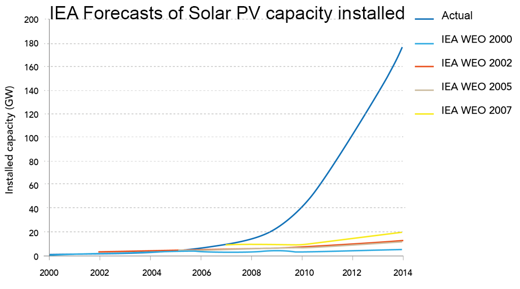 The graph below compares estimates of the installed capacity of photovoltaic power cells made in 2000, 2002, 2005 and 2007 by the International Energy Agency with the actual. Propelled by plunging costs and government policy the actual growth made mockery of the forecasts.