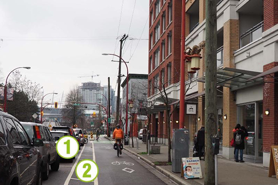 The group also finds that many people would walk or bike more if they felt safer doing so. They say the way to make them feel safer is to re-design city streets to provide wider sidewalks and protected bike lanes. They refer to these as “complete streets” and point to Union Street (a former 6 lane street depicted in the picture above) in Vancouver as a typical example. Here, bicyclist are protected from moving traffic by a buffer zone of parked cars. Bike riders and pedestrians are also kept separate from each other.