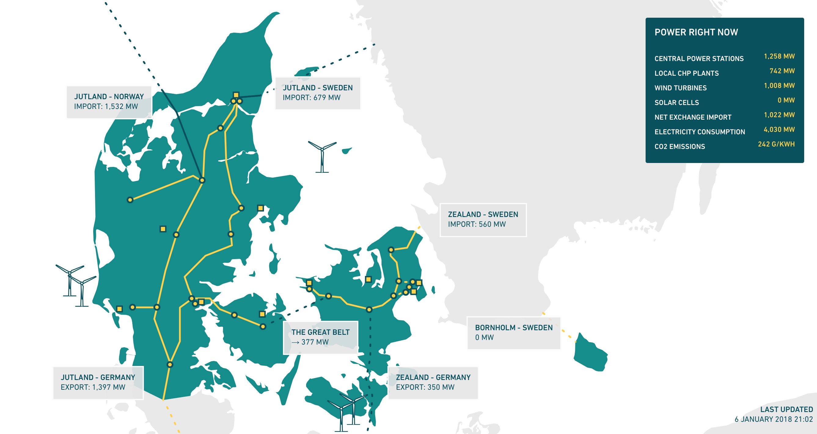 Note the immense amount of power being exchanged between the countries this relatively quiet evening. Denmark is in a unique position this way. And remember that when storage gets implemented over the years, the utilization of the transmission lines can easily double.