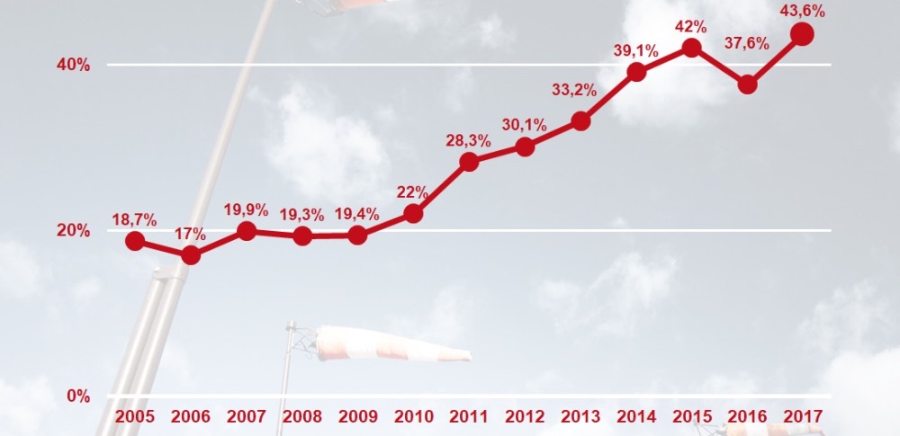 Wind turbines delivered power equivalent to 43.6 percent of Denmark’s electricity consumption in 2017. This is a new milestone in the effort to transition the energy supply system in the country to be carbon neutral.