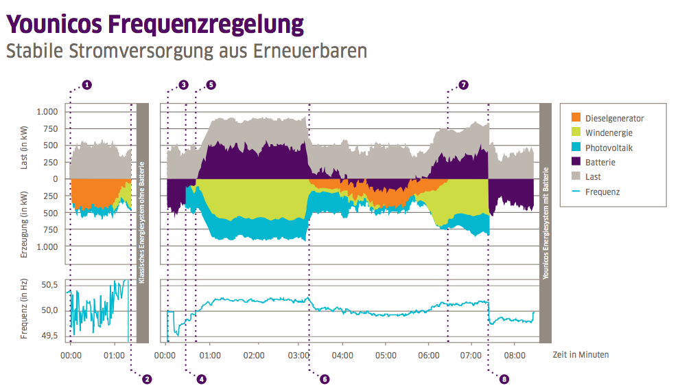 Take a look at these charts from Younicos, a German energy storage startup I recently visited on a cleantech tour of Germany, for a better visual understanding of how battery storage compares to conventional power plants used as backup: